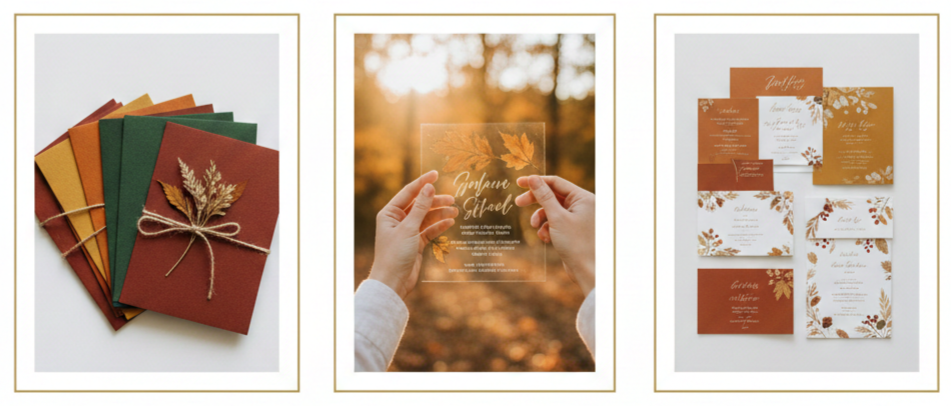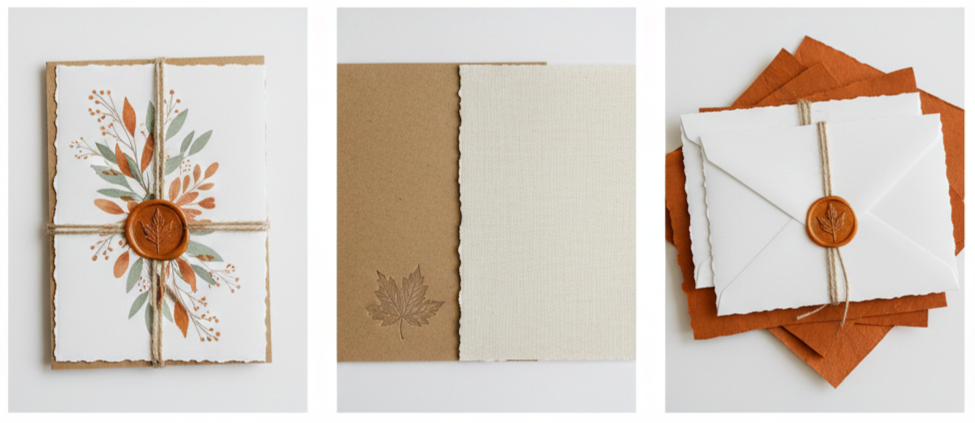 - Pick your print method carefully: Letterpress, embossing, or foil stamping work beautifully with fall tones and add visual texture.