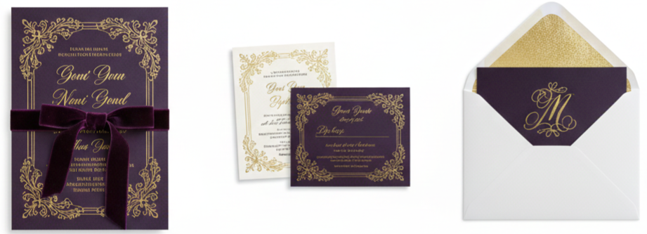 - Design ideas: Use plum cardstock layered with gold foil or metallic printing. Velvet ribbons or ornate borders turn up the drama. Baroque-style artwork and gold calligraphy complete the look.