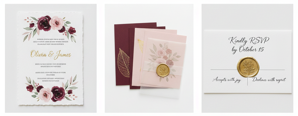 | Burgundy & Blush | Romantic, Soft | Garden, Vineyard | Watercolor, Calligraphy |