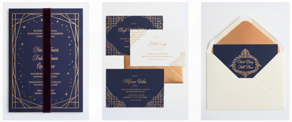 - Design ideas: Go for navy cardstock with copper foil stamping. Geometric designs or a starry night motif look amazing in this combo. Metallic envelope liners give a luxe feel right away.
