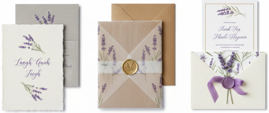 - Decorative Envelope Liners: Use soft patterns or watercolor lavender art that ties in with your invitation design.