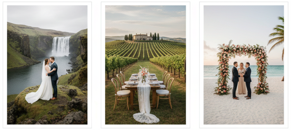 More couples are leaning into natural settings like vineyards, mountaintops, beaches, and botanical gardens. These venues create a romantic atmosphere with minimal decorating needed, thanks to their scenic beauty.
