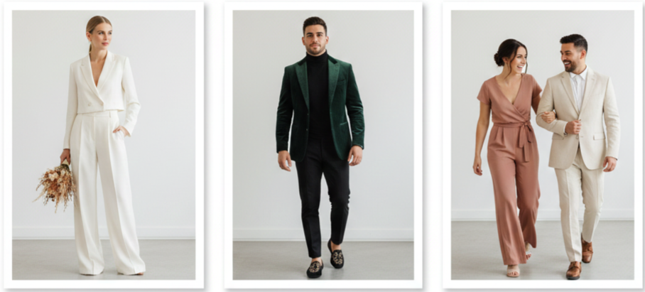 | Wedding Party Outfits | Matching dresses/tuxes | Mixed styles, gender-neutral wear |
