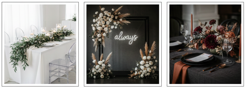 - Modern color palettes: Moody shades like plum, navy, rust, and matte black are replacing traditional pastels. These colors bring depth and edge to everything from table settings to bouquets.