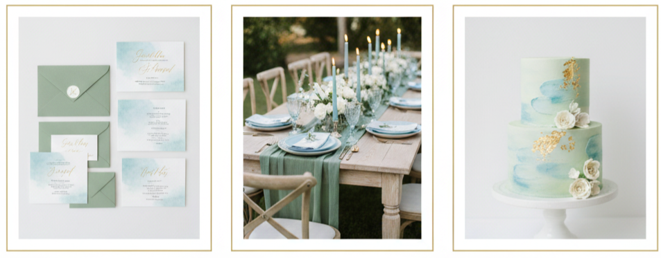 | Sage & Sky Blue | Natural & Calm | Outdoor coastal venues |