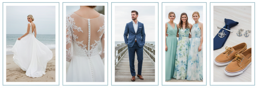 Wedding attire is one of the easiest and most stylish ways to incorporate nautical elements. Modern nautical fashion leans toward lightweight fabrics, clean lines, and small, meaningful details that tie everything together without feeling costume‑like.