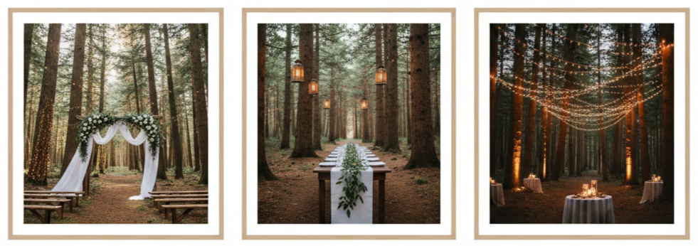 Beach venues create a relaxed and breezy atmosphere. You get the sound of the waves, wide-open sky, and soft sand underfoot. Just keep an eye on tides, wind, and weather forecasts, and have a backup plan ready so everything runs smoothly. Woodland spaces offer a storybook setting with tall trees, earthy scents, and plenty of opportunities for creative lighting like lanterns or string lights hanging from branches.