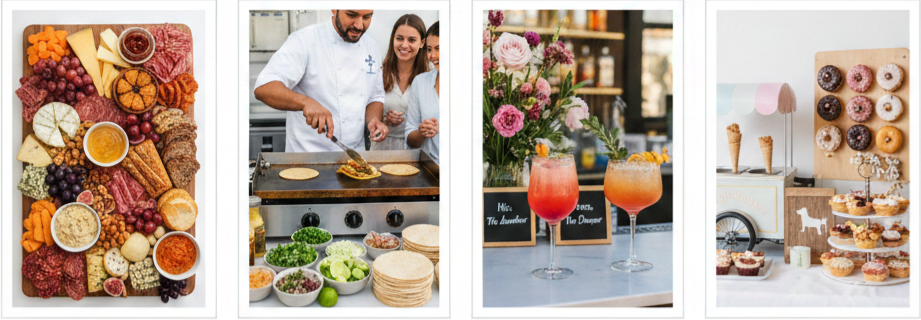 Food can double as entertainment when you use creative serving ideas. Grazing tables filled with cheeses, breads, fruits, nuts, and spreads create a relaxed, abundant feeling. Guests can snack throughout the event rather than waiting for a formal dinner.