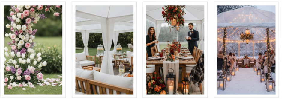 | Winter | Lanterns, faux furs | Heated tents, warm drinks | Cold temps, snow or ice |