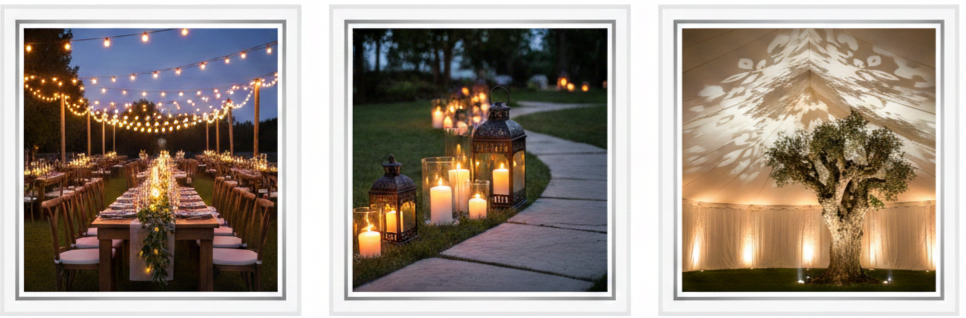 Candles and lanterns create soft, romantic lighting. They help illuminate pathways, dinner tables, or the ceremony area. Uplighting can highlight trees or structures, adding depth and dimension to the setting. Projected patterns or stars on a tent ceiling can make the space feel even more unique.