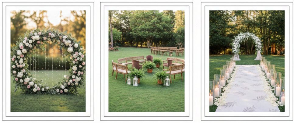 - Ceremony Arches: Floral, wooden, or fabric designs that match your theme.