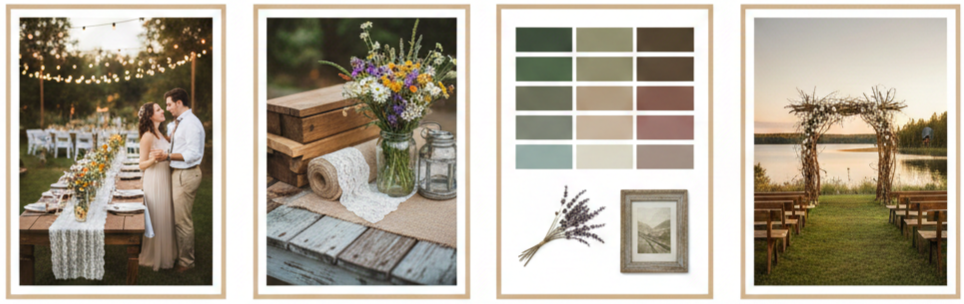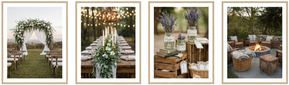 - Common materials: Reclaimed wood, burlap, lace, and natural florals set the tone. Think of mason jars, wildflowers, antique frames, and candle-lit lanterns.