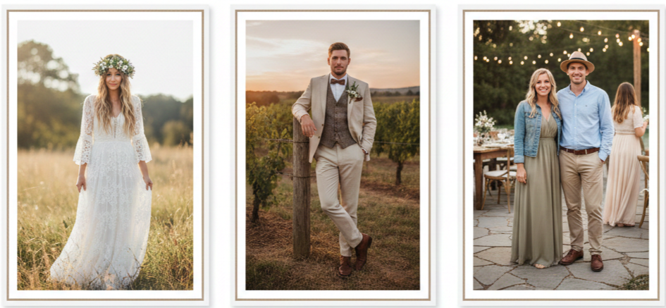 - Groom’s outfit: Tweed or linen suits in neutral shades like brown, beige, or gray. Add suspenders, a casual tie, or boots for personality.