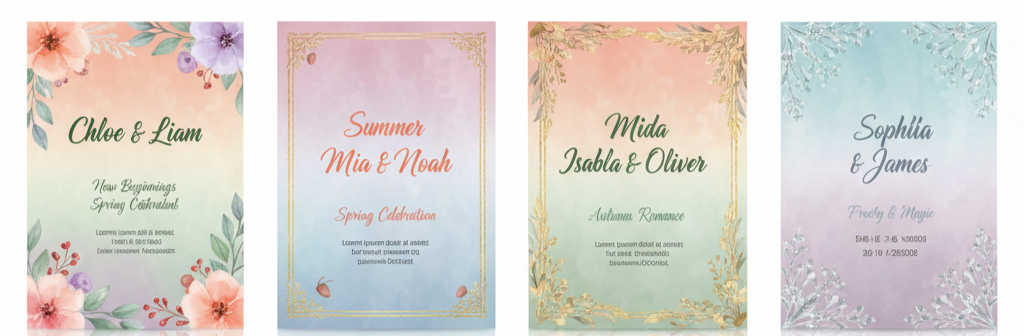 - Invitations and Signage: Set the tone early with watercolor-style invitations or pastel-printed stationery. Continue the design theme across your signage, menus, and welcome boards for consistency.