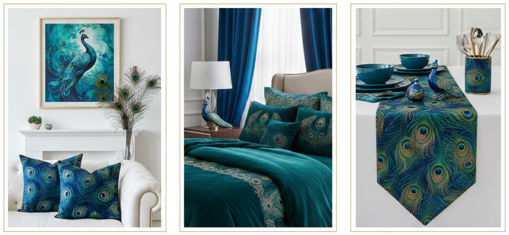 - Bedroom design: Choose bedding in turquoise or emerald with feather details. Velvet curtains in bold tones like royal blue bring in softness and richness. Lamps with peacock designs or feather motifs can make great bedside additions.