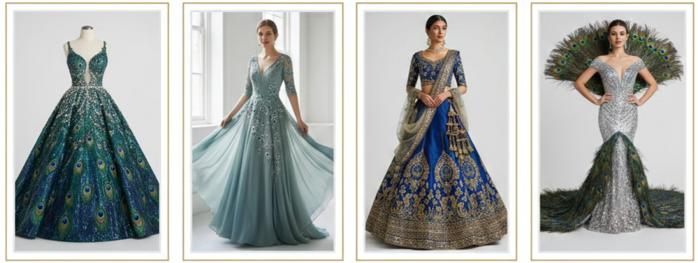 There’s no single version of a peacock-themed gown. Brides choose this style in several creative ways, depending on how bold, modern, or traditional they want their look to be.