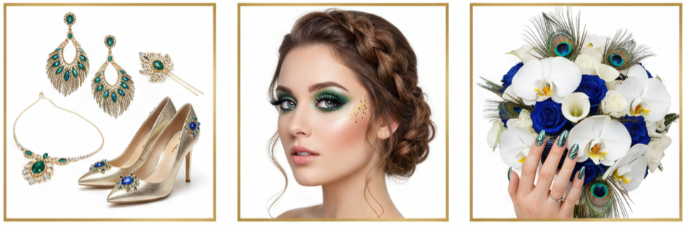 Styling completes the look of any peacock wedding dress. Everything from accessories to makeup works together to create a cohesive theme.