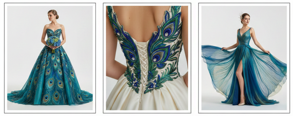 - Silhouette Options: Whether you love ball gowns, mermaid cuts, A-line dresses, or sleek modern shapes, peacock elements can be worked into almost any silhouette. The theme adapts easily to whatever style feels right for your wedding.