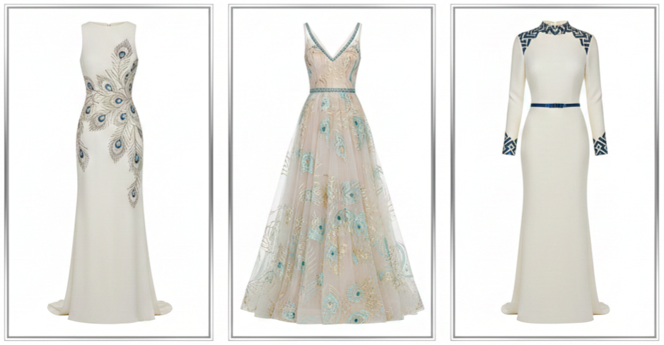 If you want something elegant with just a touch of peacock inspiration, this is the way to go. You might see a clean silhouette with embroidered feather shapes, or a soft ivory gown with just a hint of teal detailing. Modern dresses bring the theme to life without overwhelming the overall look.
