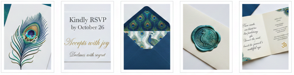 - Save-the-dates: Set the tone early by carrying your peacock color scheme into the first piece of mail your guests receive.