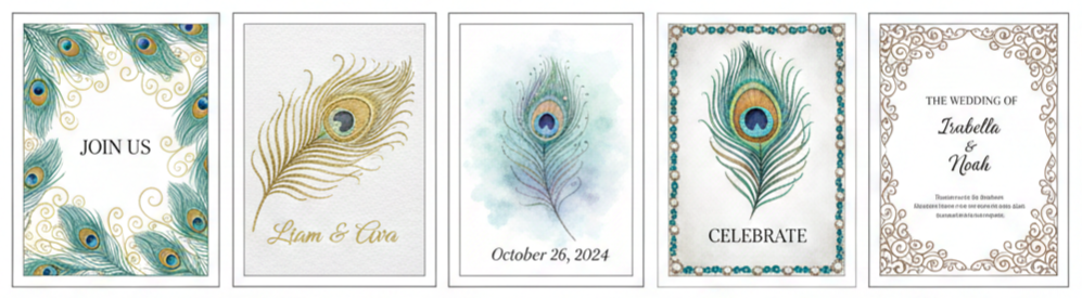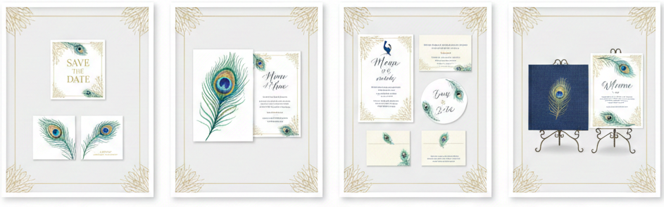 - Feather illustrations: Detailed peacock feather art adds instant charm. Some designs use full-feather borders, while others add subtle accents.