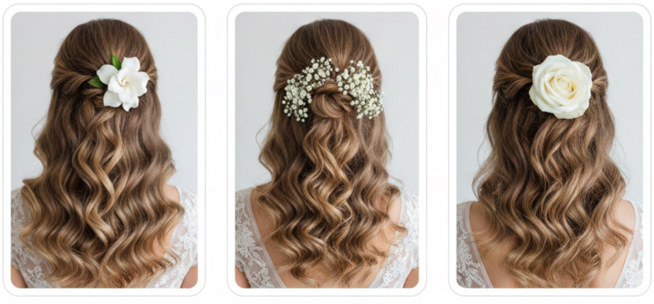 If you can’t decide between wearing your hair up or down, this style gives you both. The top part holds a flower naturally, while the loose curls or waves keep it romantic and effortless. It’s especially great for outdoor weddings where movement and texture shine.