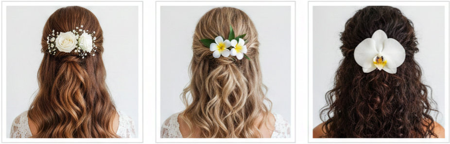 - Fresh or Faux: Fresh flowers bring a natural fragrance and beauty that’s hard to imitate. They’re unmatched in authenticity, especially orchids, roses, or gardenias, which hold up well in hair. Faux flowers, though, offer reliability. They won’t wilt, won’t bruise, and are ideal for long ceremonies or warm weather. High‑quality silk or dried blooms can look remarkably real while giving you peace of mind.