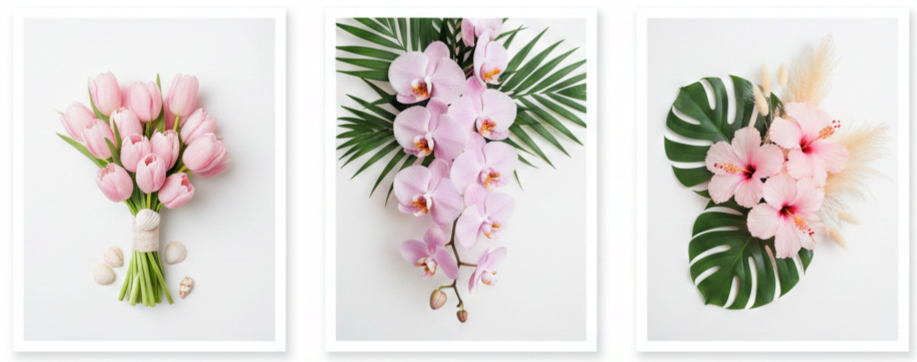 Light pink tulips, orchids, or tropical-style blooms create an airy, breezy vibe that fits coastal settings.
