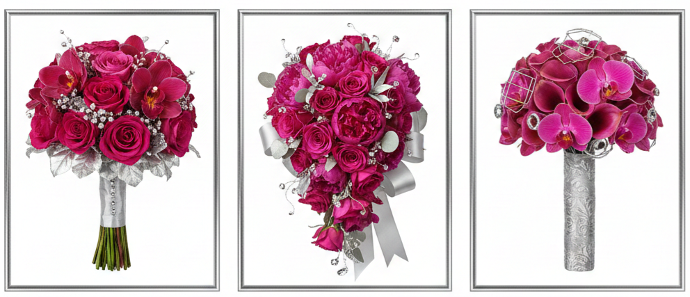 Hot pink orchids or vibrant fuchsia roses paired with metallic accents add luxury and drama.