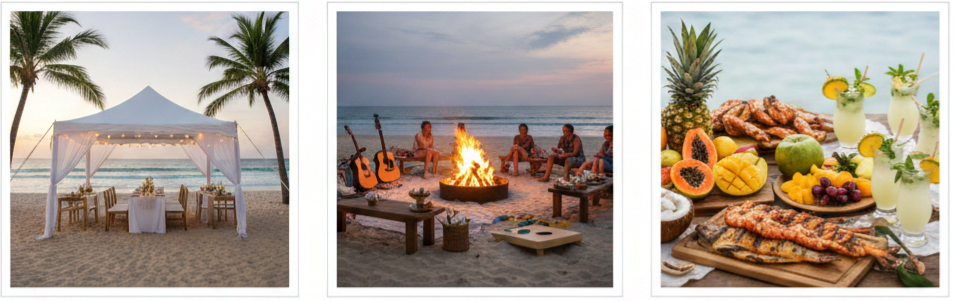 - Bonfire party: A fire pit with acoustic music, s’mores, and beach games adds a fun, casual end to the night.