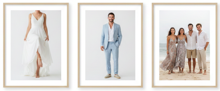- Groom’s attire: Lightweight suits in linen or cotton are perfect. Open collars and rolled sleeves add a relaxed touch.