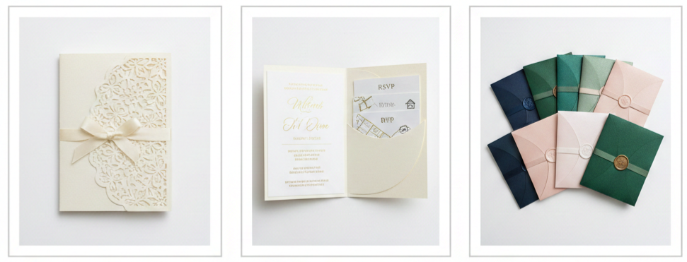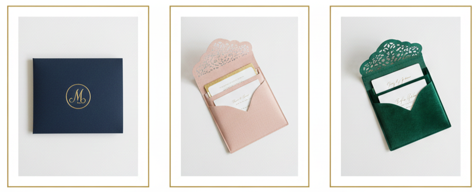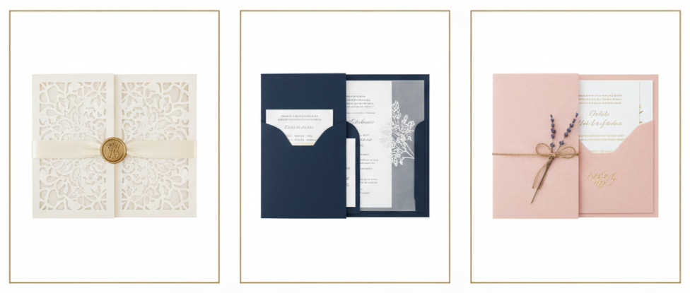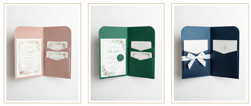 | Pocketfold | Opens like a book | Classic, structured | Formal or traditional weddings |