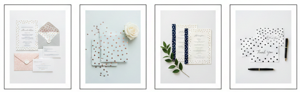 - Invitation Suites: Whether you choose dotted borders, backgrounds, or envelope liners, dots add personality without cluttering the design.