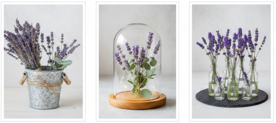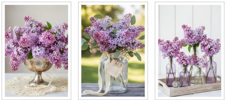 If you prefer rustic charm, lavender and lilac arranged in mason jars, wooden boxes, or vintage tins offer a simple yet warm aesthetic. Add eucalyptus or lace details to complete the style.