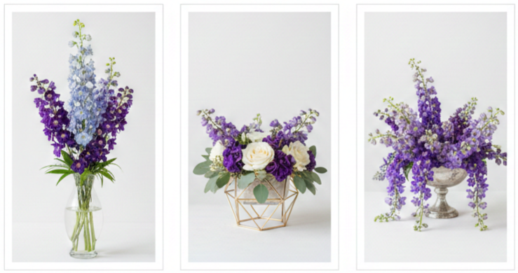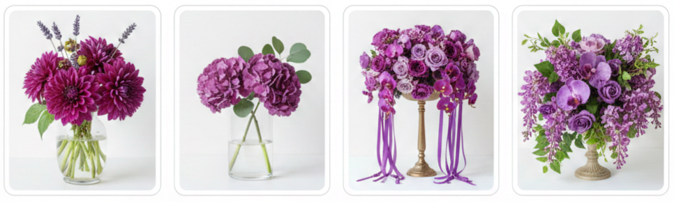Purple flowers come in many varieties, each offering something different for texture, fragrance, and style. Lavender brings a rustic, fragrant feel. Lilac has a soft vintage look and fits beautifully into spring weddings. Roses, available in several purple tones, work across all wedding themes. Hydrangeas add fullness and texture, making arrangements look rich without needing many stems. Orchids bring a modern, upscale vibe, while calla lilies offer sleek elegance. Delphiniums add height, making them great for tall arrangements.