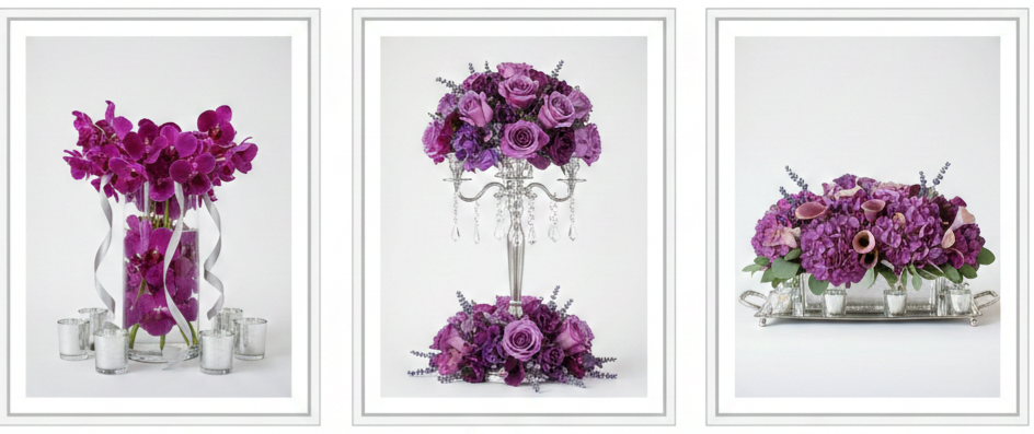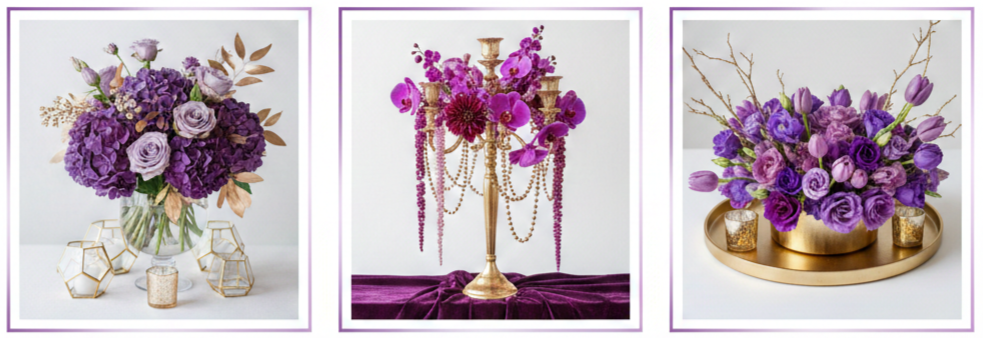 - Classic Elegance: Tall vases, deep purple blooms, candles.