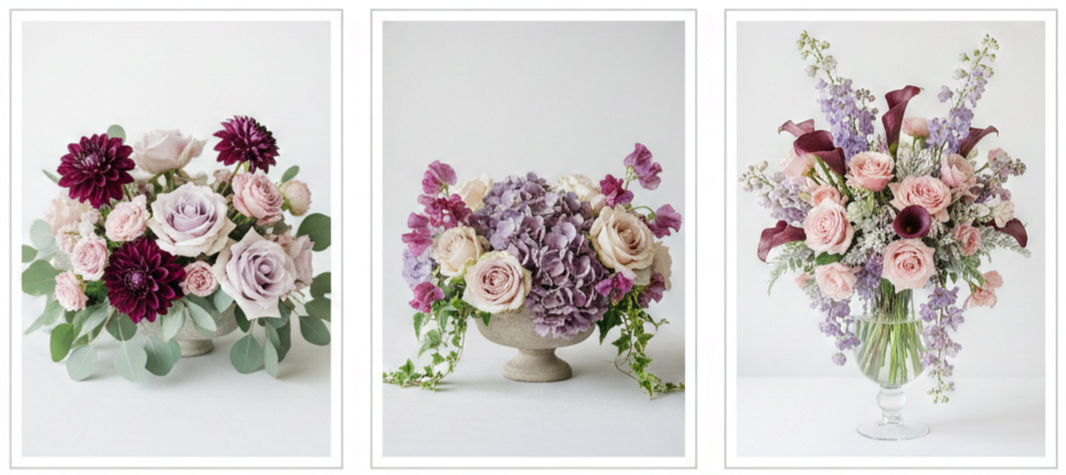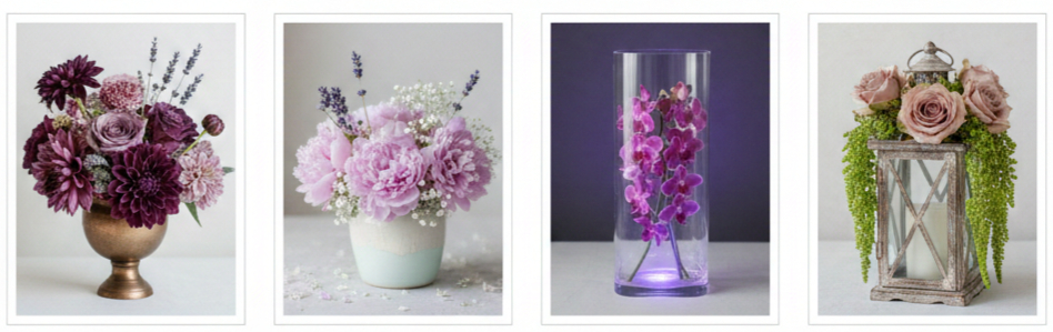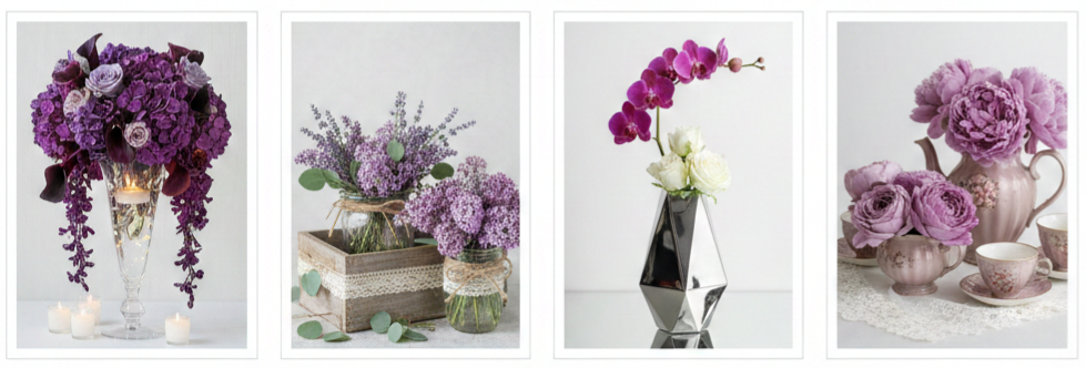 - Vintage Romance: Soft purples, antique vessels, lace accents.