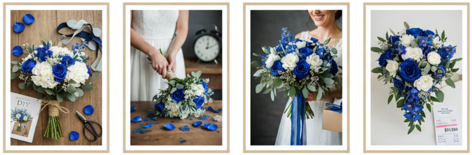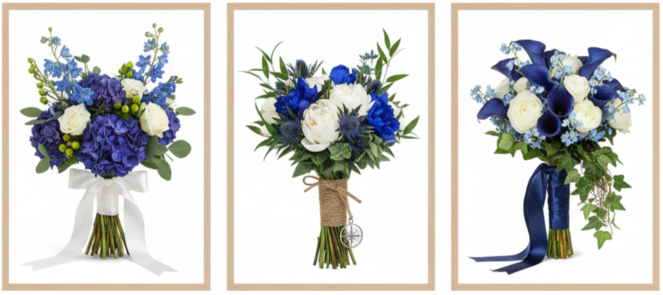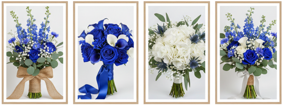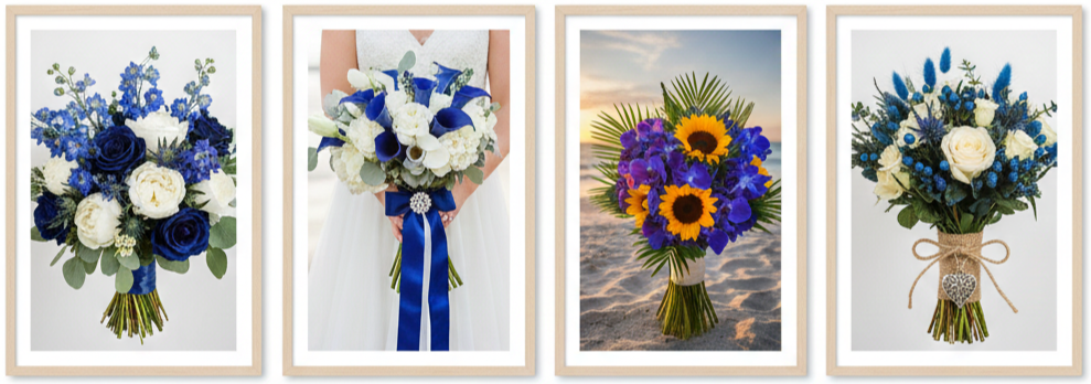 Coordinating your bouquet with the rest of the bridal party helps create a cohesive and polished look. Bridesmaid bouquets don’t need to match exactly—they can feature fewer blue flowers or more neutral tones for balance. A ribbon in royal blue brings them together without overwhelming their arrangement.