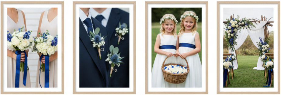 Boutonnières for the groom and groomsmen can include small blue flowers or subtle accents that complement your bouquet. Flower girls can carry baskets with a mix of blue and white petals or wear crowns tied with blue ribbon.