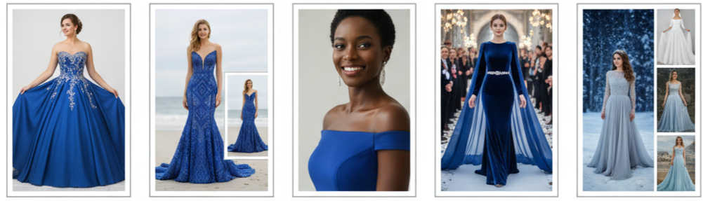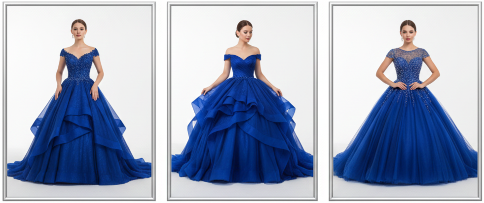 These silhouettes offer a dreamy, princess-like effect. Royal blue emphasizes each fold, layer, and detail, creating a dramatic entrance.