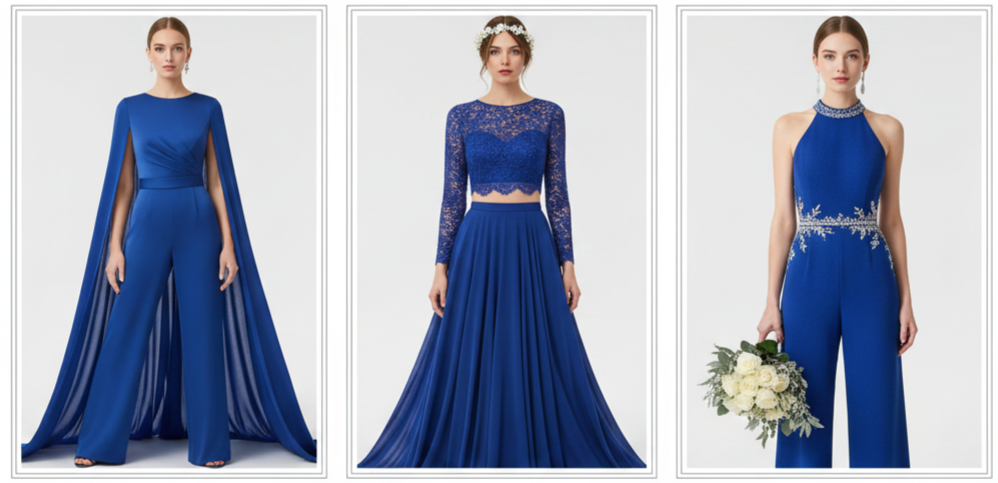 Brides wanting a contemporary twist often lean toward pantsuits, bridal jumpsuits, or mix-and-match pieces in royal blue to express individuality with elegance.