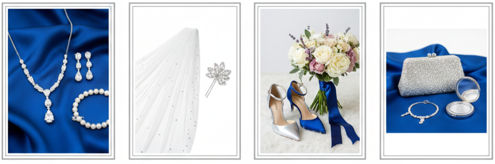 - Shoes: Metallics (especially silver) are the most popular choice. Brides seeking a monochromatic look can choose royal blue heels for an extra-cohesive finish.
