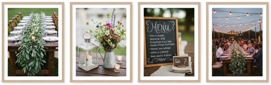 - Personal Details: Chalkboard menus, wooden table markers, simple fabrics