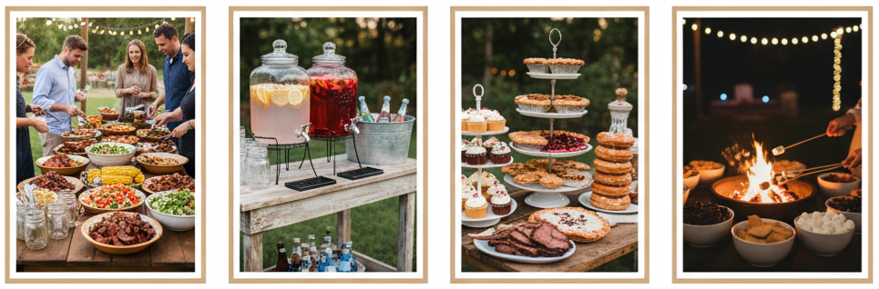 - Dessert Options: Pie bars, donuts, cupcakes, s’mores stations