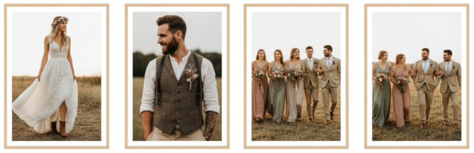 Grooms can embrace the rustic style with suspenders, tweed vests, linen suits, or rolled-up sleeves. A boutonniere using dried flowers or herbs adds a nice handmade touch. The wedding party can coordinate with soft, muted tones like sage, blush, or earthy neutrals.