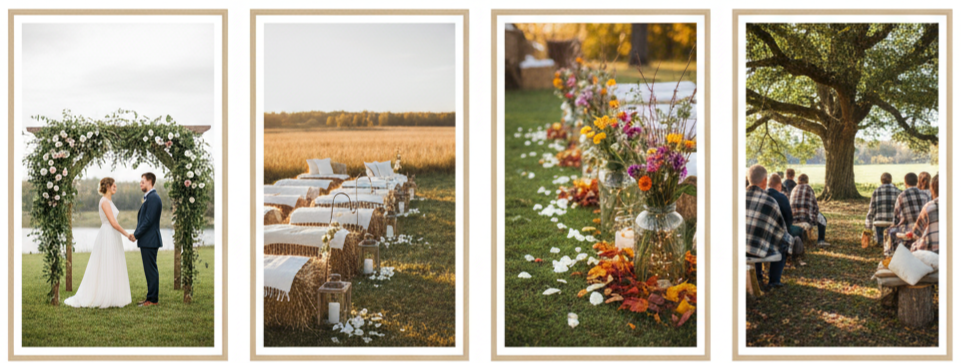 - Ceremony Highlights: Wooden arches, hay bale seating, petal-lined aisles