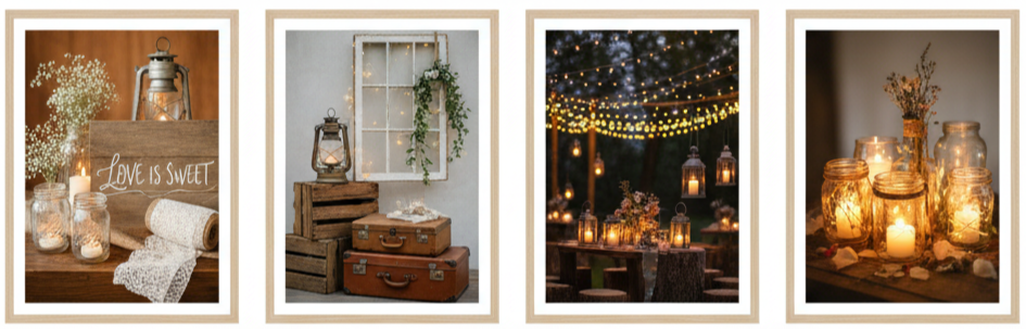 - Key Décor Elements: Mason jars, lanterns, reclaimed wood signs, lace, burlap