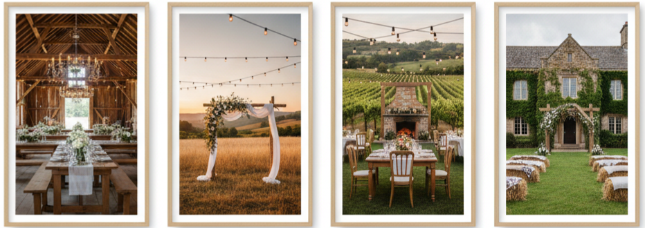- Venue ideas: Barns, open fields, vineyards, and countryside estates all work great.