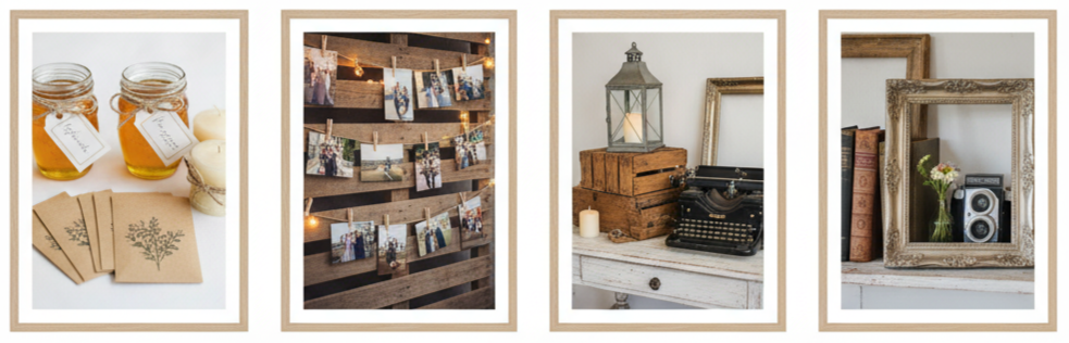 Use mason jars, recycled wood, wildflowers, and DIY signs. Check thrift stores or garage sales for vintage items that fit your theme.