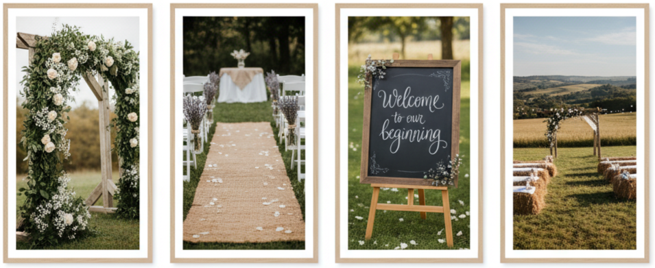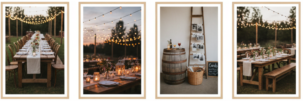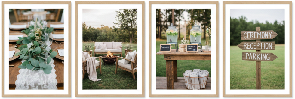 - Signage: Chalkboard or reclaimed wood signs add charm and help guide guests.